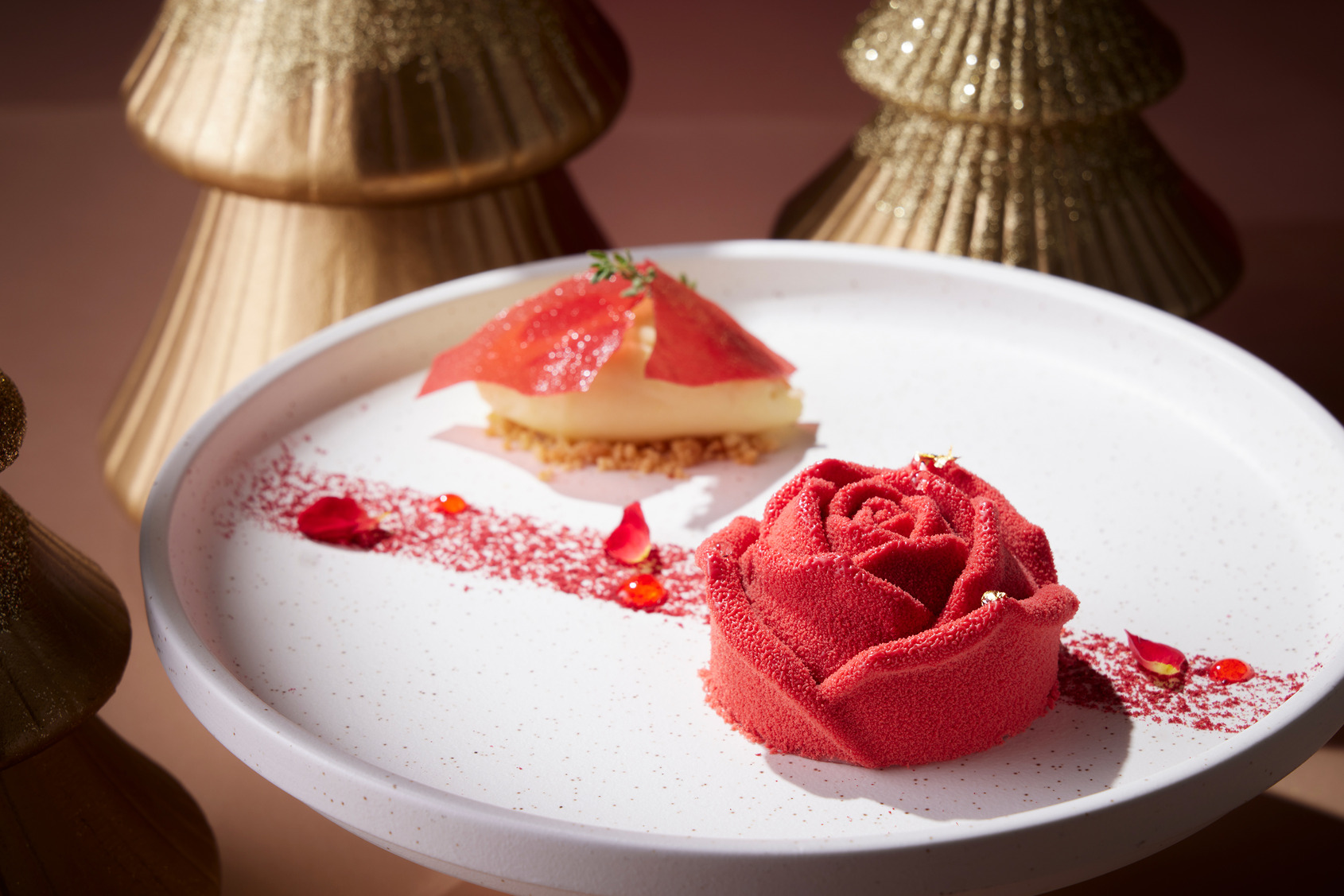 玫瑰造型的「永恆玫塊」綻放花朵嬌媚姿態,耀眼奪目的紅色可可花瓣下,蘊藏著莓果芬芳的紅寶石巧克力慕斯、南投埔里新鮮玫瑰製成的玫瑰果凍、鬆綿的杏仁蛋糕,以及酥脆的香草沙布列,佐以馬達加斯加新鮮香草莢做成的冰淇淋與草莓糖片,完美交織絕佳迷人滋味。