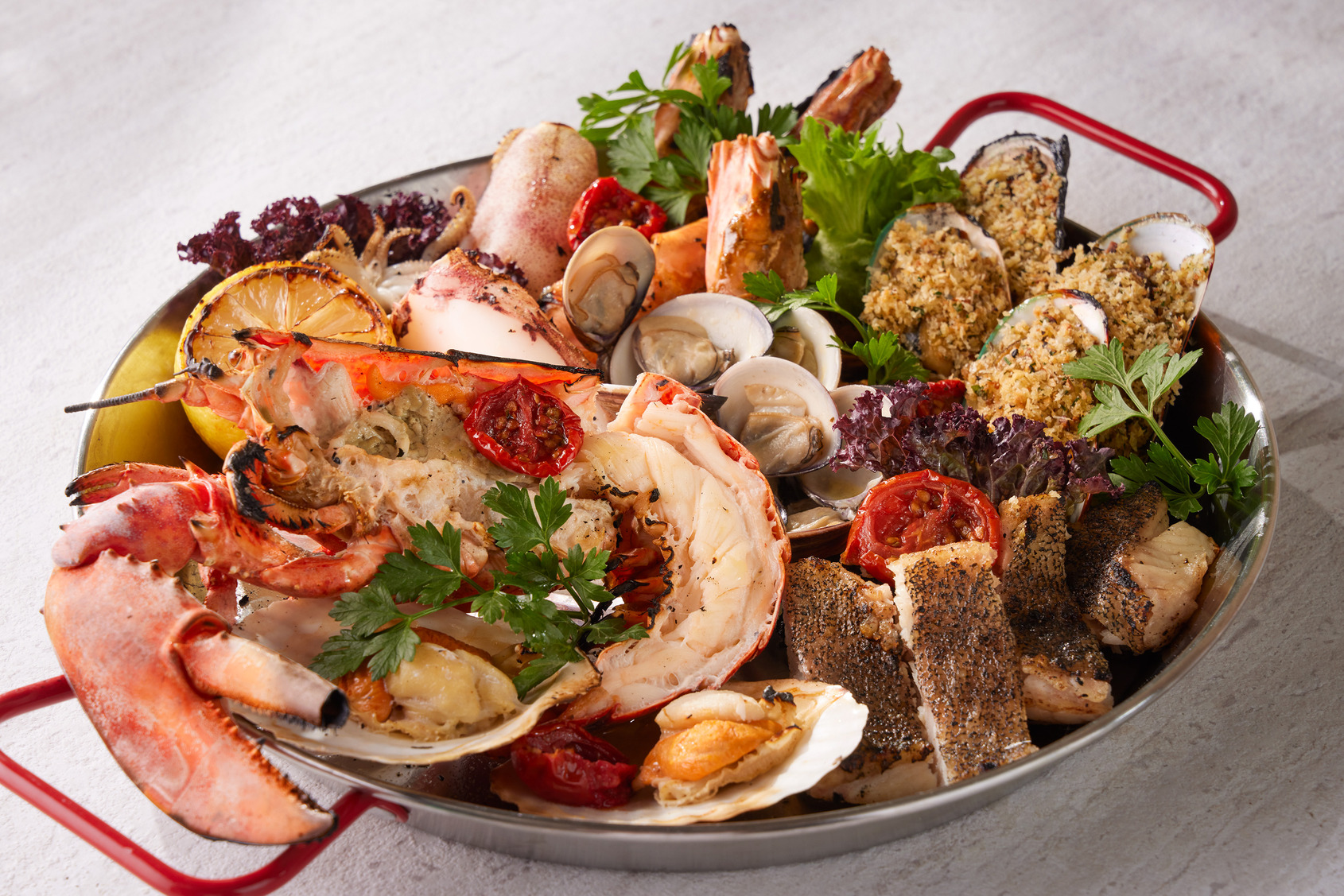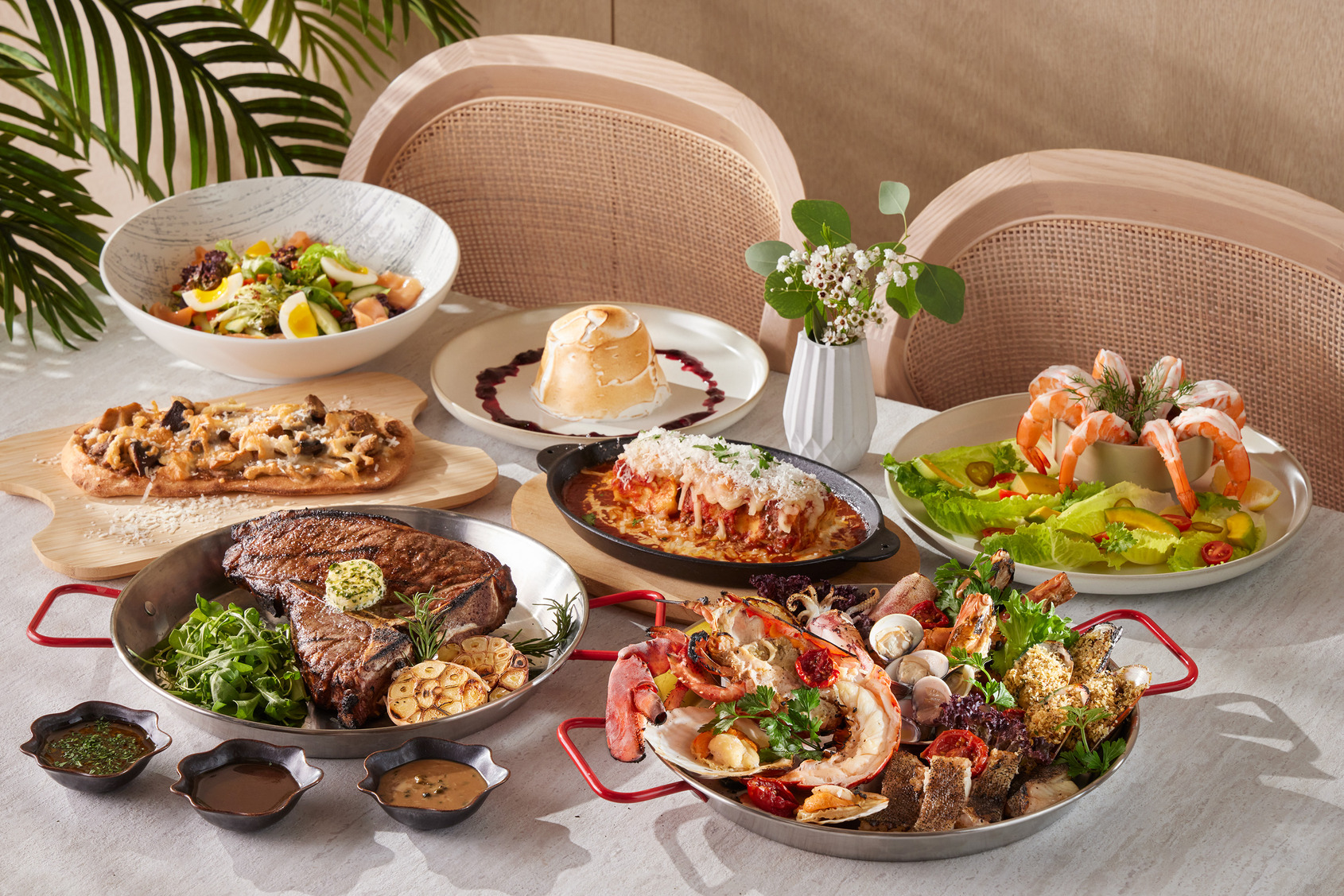 海鮮愛好者則推薦「海鮮拼盤佐雷莫拉與阿根廷青醬」澎湃放上爐烤明蝦、中卷、扇貝、蛤蜊、淡菜及季節鮮魚,搭配清爽阿根廷青醬,滿滿海味清爽滿足,另可加價1,680元升級鮮活龍蝦。