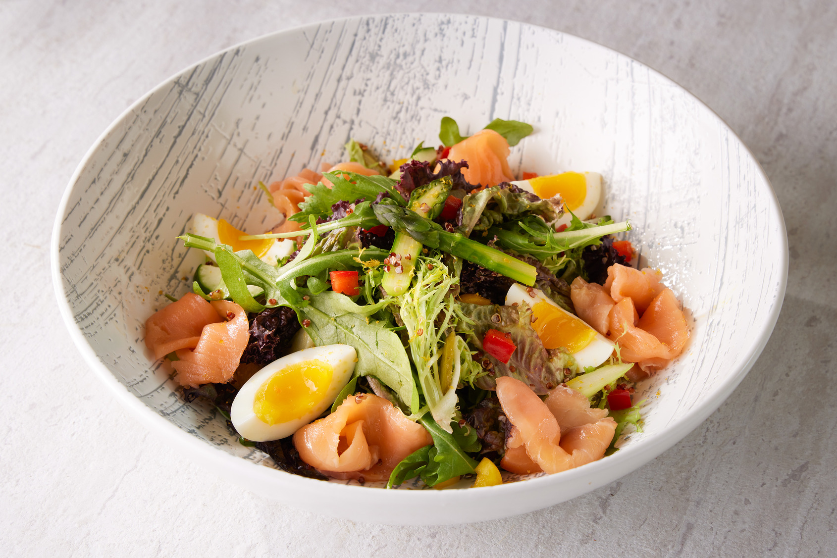 特色沙拉推薦「挪威沙拉」以燻鮭魚的鮮嫩及淡雅的煙燻味為主角,拌入藜麥、甜椒、黃瓜、酸黃瓜與鮮嫩蘆筍,搭配清爽的蒔蘿檸檬油醋,堆疊出輕盈豐富的層次口感。